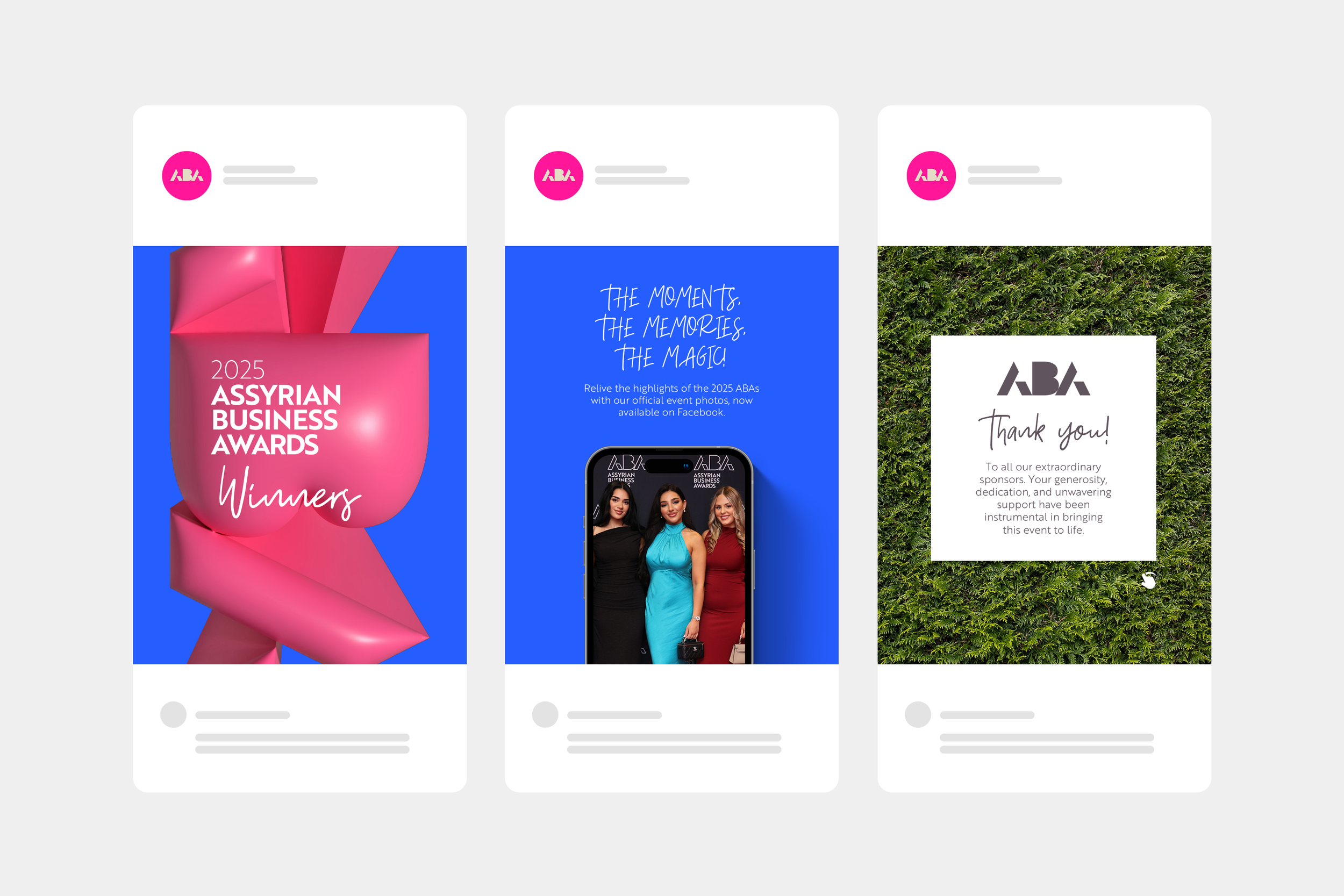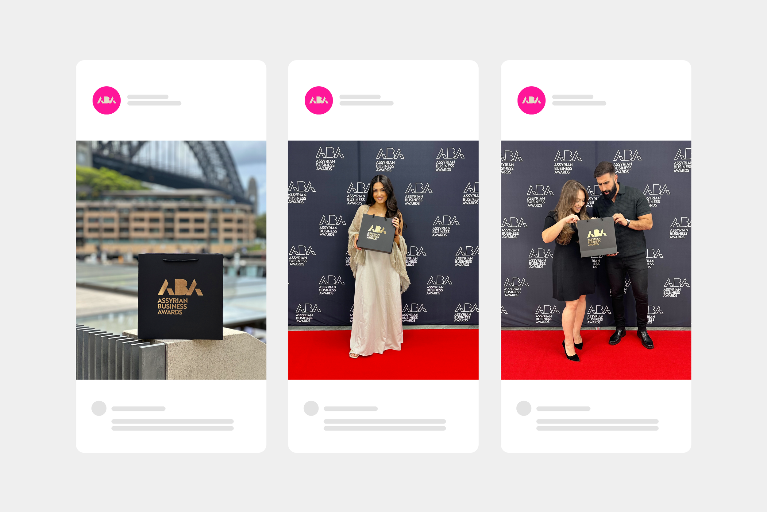 VISEUM delivered a complete branding and event design solution for the Assyrian Business Awards (ABAs). This included the development of the brand identity, website, digital and print marketing assets, social media strategy, and event design; from floor plans and on-screen visuals to the attendee experience. We also designed the award itself and custom packaging for event show bags, ensuring a cohesive and premium experience from start to finish.